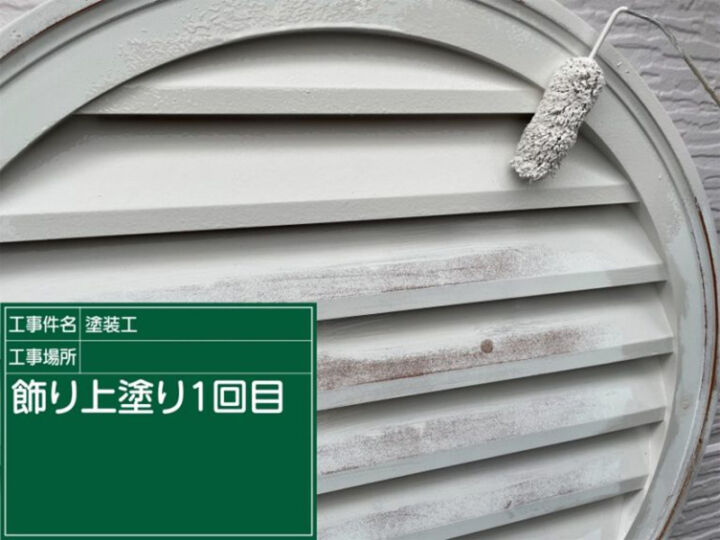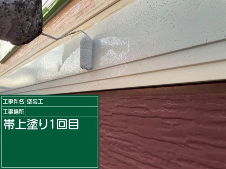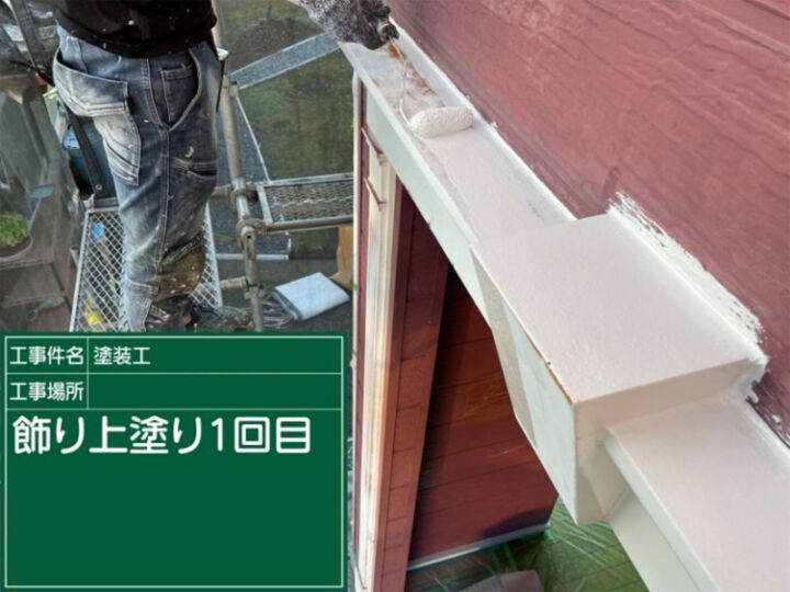 1階と2階を分ける帯や、玄関周りの飾りを塗っていきます。