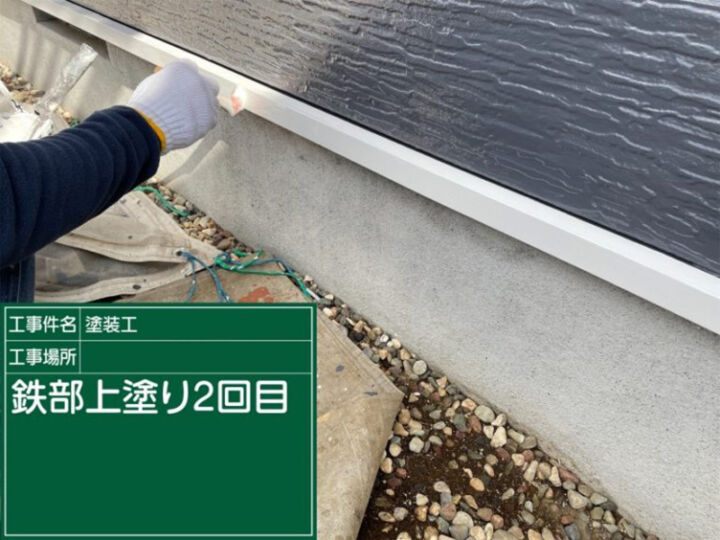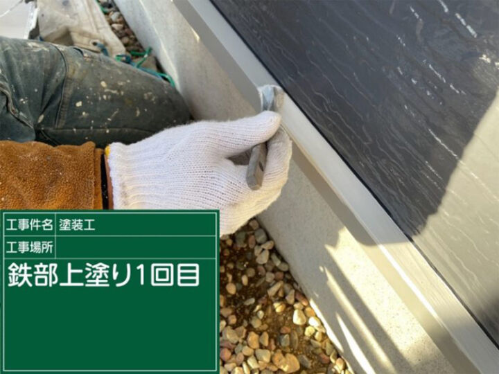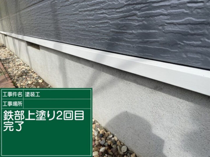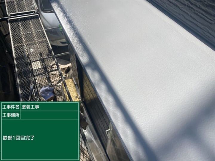 庇部分も金属製のため防サビ塗装のあと上塗りを行いました。