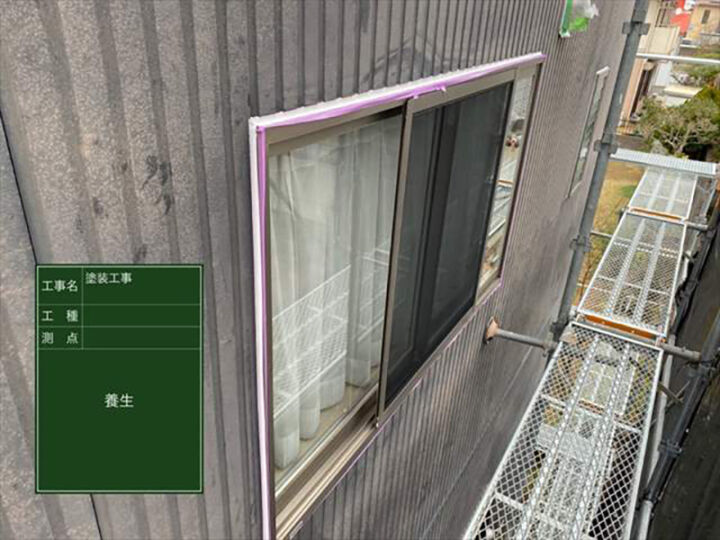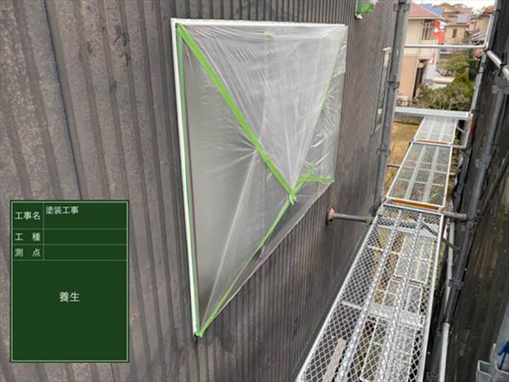 窓など塗装しない面に塗料がついてしまわないよう、ビニールシートやマスキングテープなどで養生していきます。