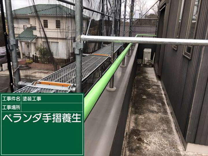 ベランダの手すりは塗装をおこないませんので、塗料で汚れないよう養生をしていきます。
