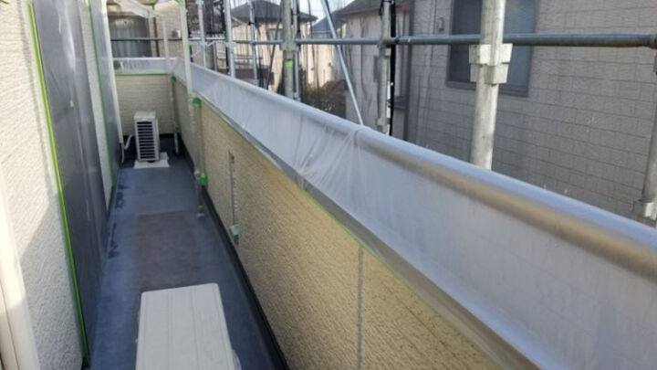 ベランダの手すりも養生します。