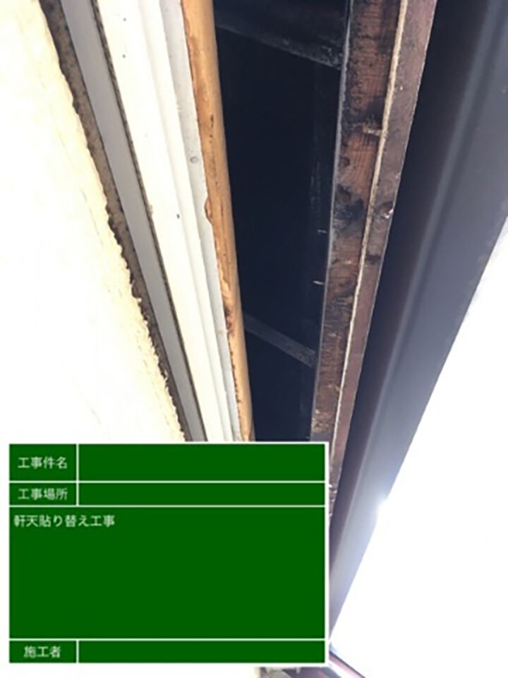 傷みが激しいので新しい軒天材に交換する必要があります。