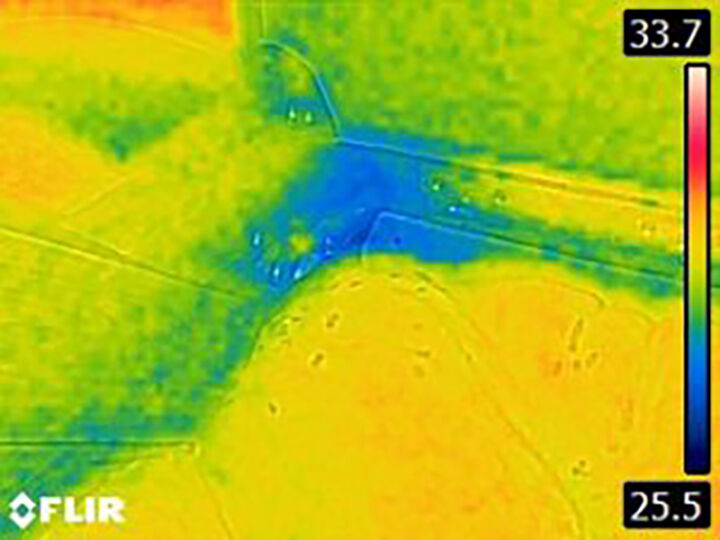 青くなり温度が低い場所に湿気が溜まっています。