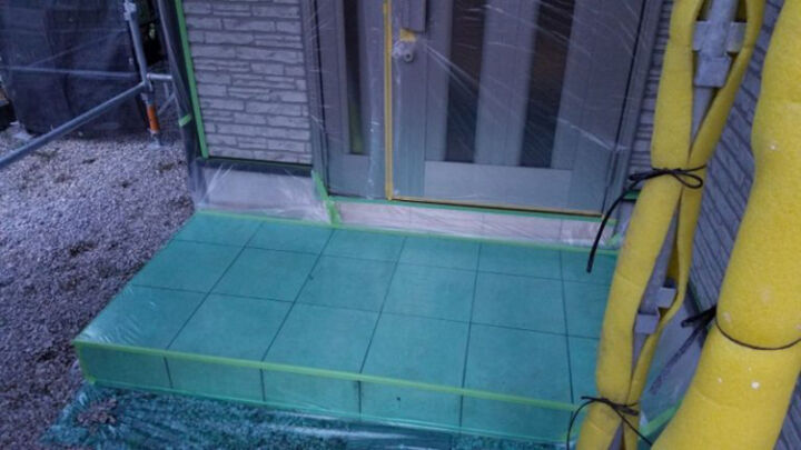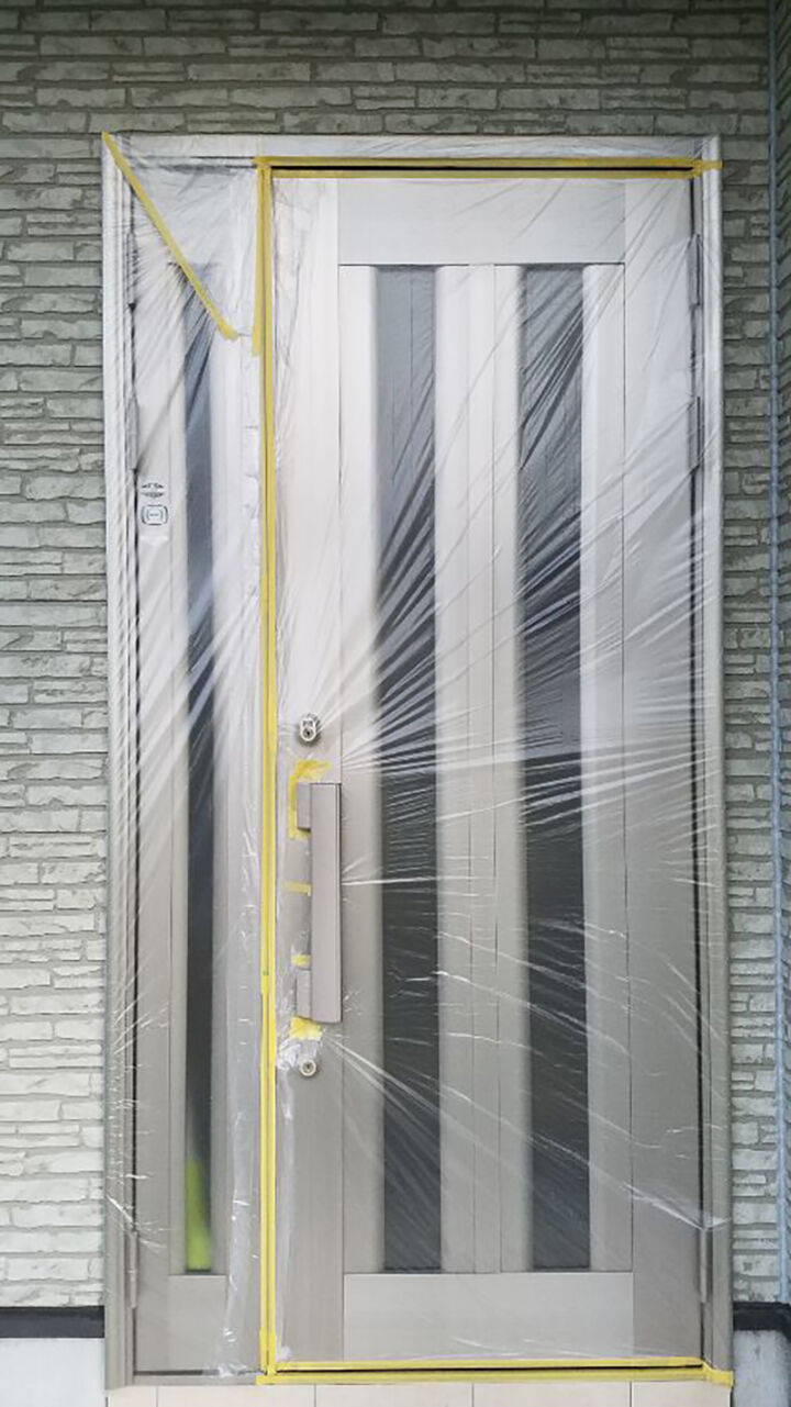 養生シートはつるつると危ないので、玄関まわりには滑り止めを設置し安全を確保します。