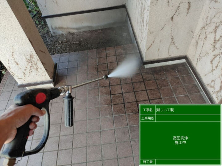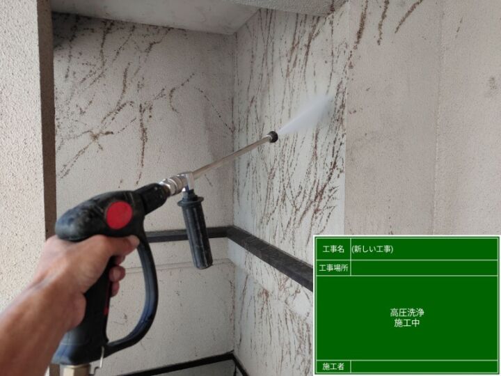 このあと、外壁塗装を行うので、高圧洗浄機で汚れを落としていきます。