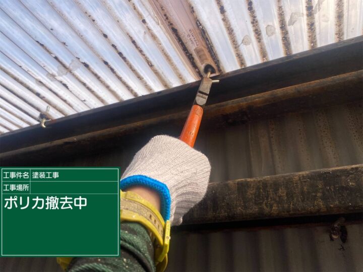 変色、硬化したポリカ波板は強度が低くなり割れやすくなってしまっています😵💫