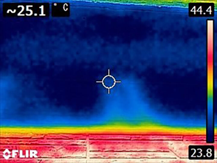土浦市の軒天は、サーモカメラで真っ青になるくらいに温度が低くなっています。