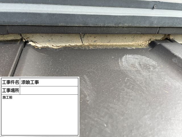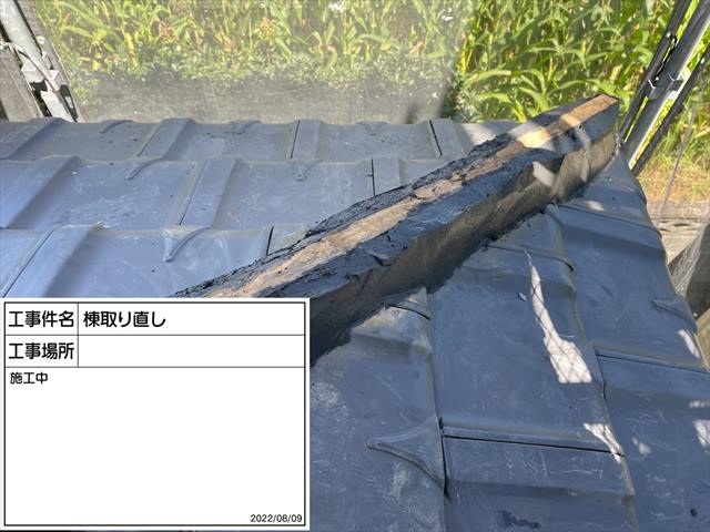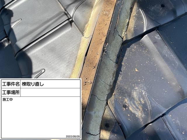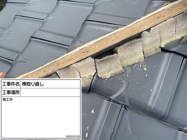棟瓦を外す前から、漆喰がひび割れてボロボロなのがわかります。