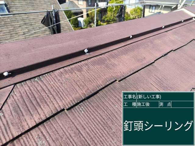 棟板金は釘で固定されていますが、金属のため熱による膨張と収縮で徐々に動いてしまいます。