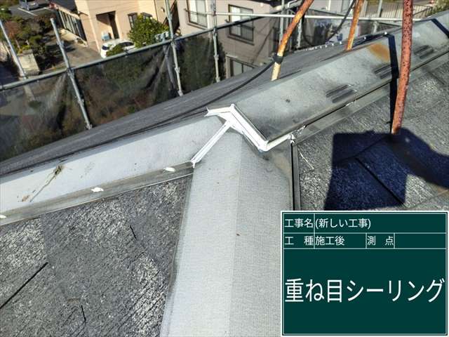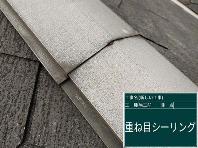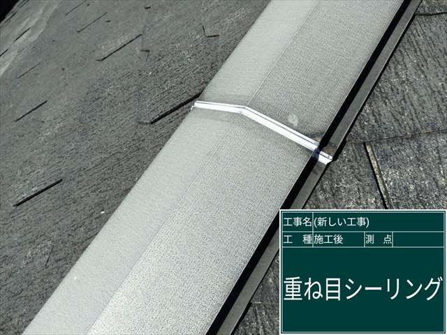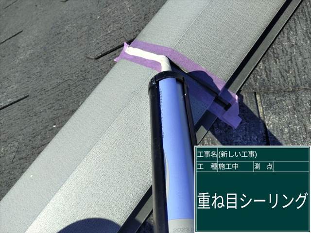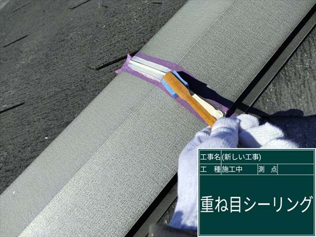 棟板金の重ね目の隙間には、プライマーを塗布して、新しいシーリングを打ち込み、ヘラで均す、という、外壁シーリングの増し打ちと同様の作業をおこないます。