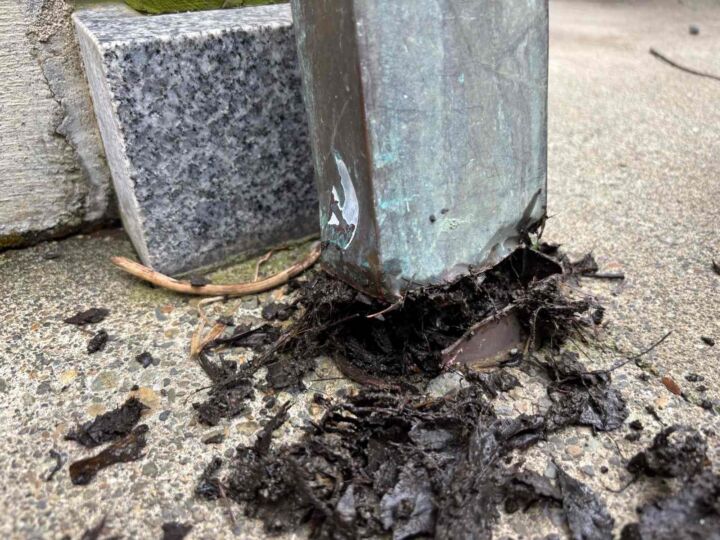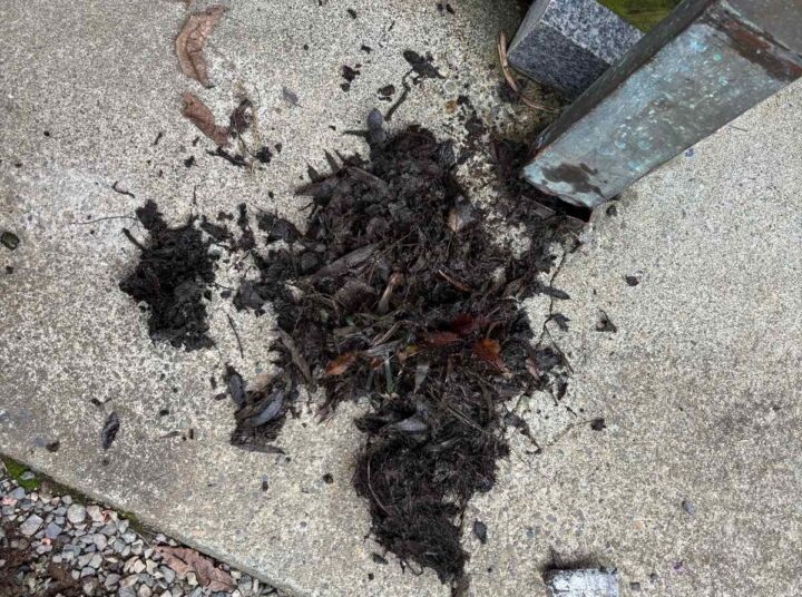 枯れ葉やホコリ、土などが長年堆積した結果、雨水を含んで常に水をポタポタ垂れ流すようになってしまっていました😫😫😫