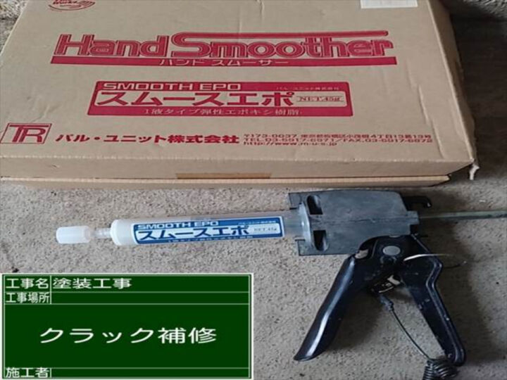 モルタル外壁のひび割れをエポキシ樹脂を使って補修していきます。