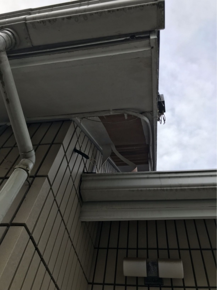 現場に伺って確認すると、2階部分の軒天(のきてん)と呼ばれる箇所のベニヤ板が剥がれ、一部が垂れ下がっている状態😣