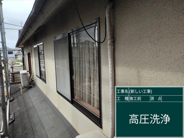 モルタル外壁の小美玉市現地、塗装の前に高圧洗浄で長年蓄積した汚れを落としていきます。