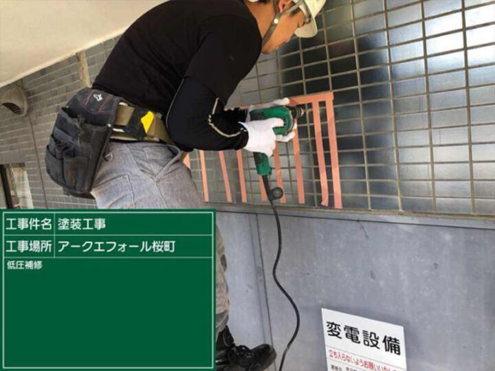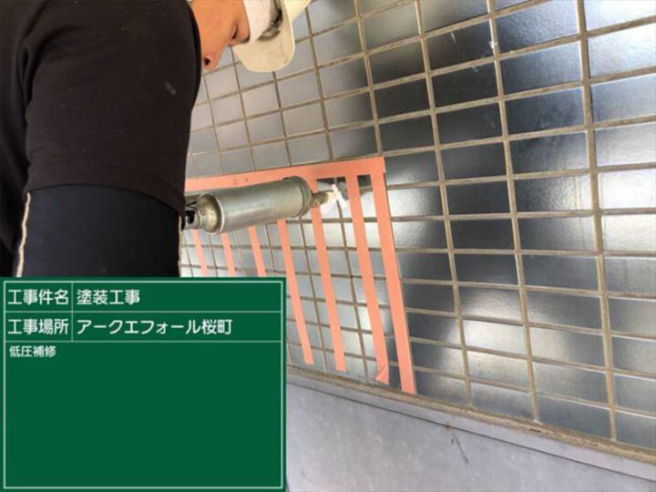 土浦市のマンション、外壁タイルの低圧補修の様子です。