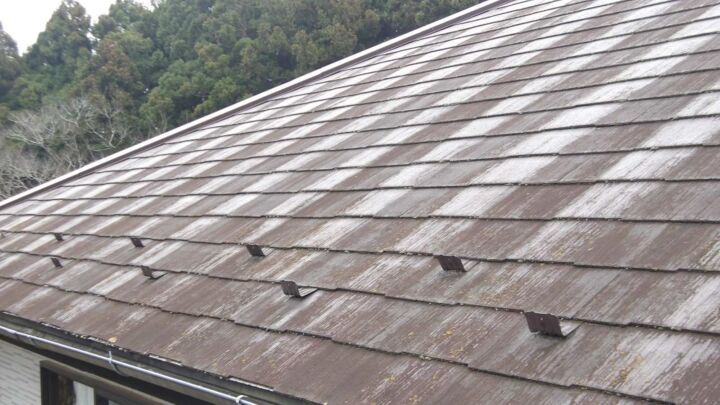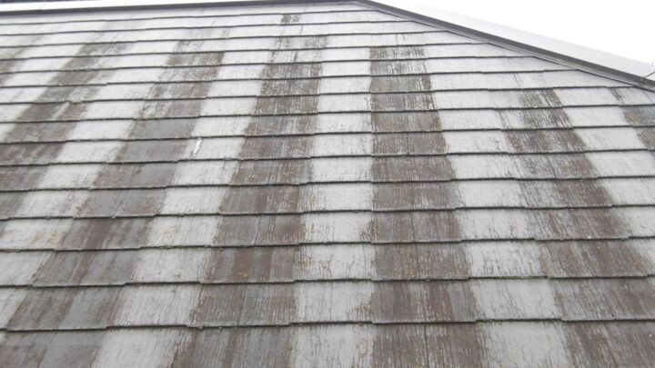 全体的にスレート瓦が傷んで、色褪せ・雨染みが目立っています☔