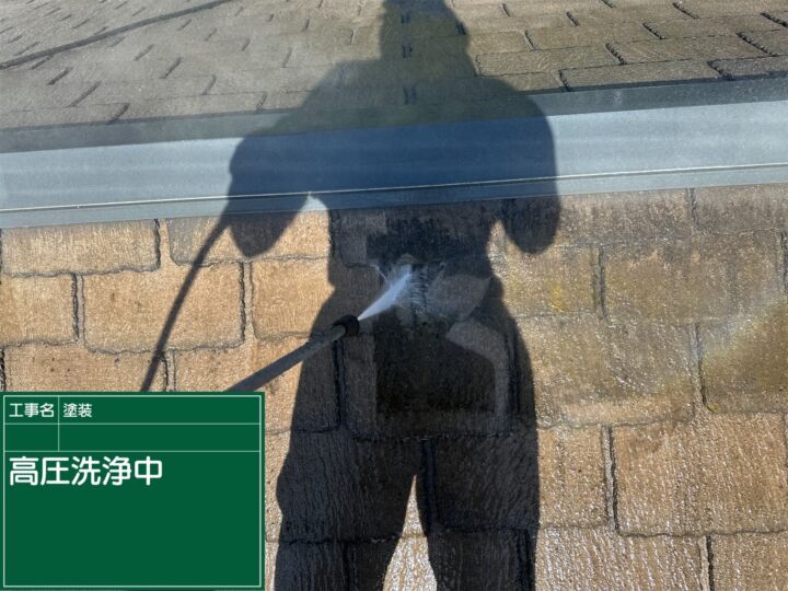 屋根の汚れを流して、シーガードがしっかり施工できるようにします✨️