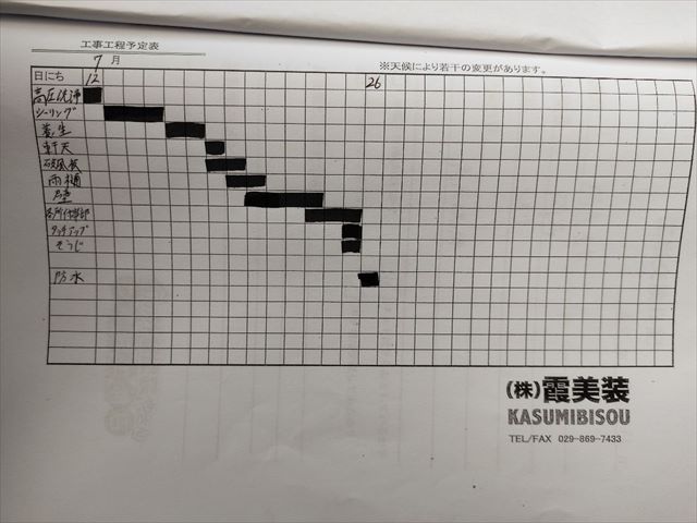 霞美装ではこのような工事工程予定表をお渡しして、施工の目安をお伝えしています。