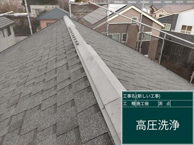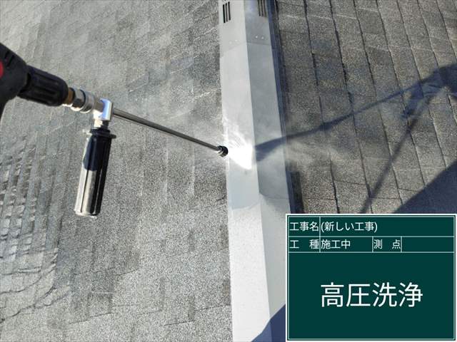 アスファルトシングルの屋根は表面に吹き付けてある石粒を落とさずに、汚れを洗い流せるよう水圧を調整しておこないます。