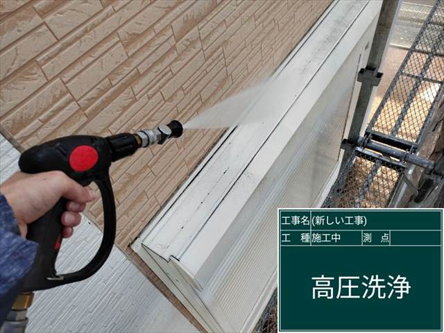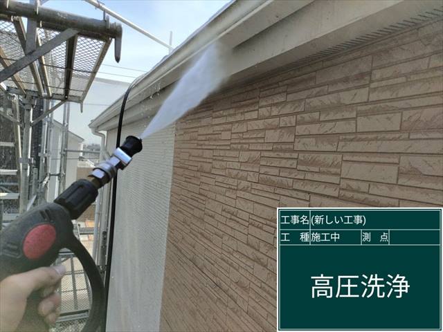 石岡市 築8年の外壁塗装現場。新築時から蓄積した汚れを高圧洗浄で落としていきます