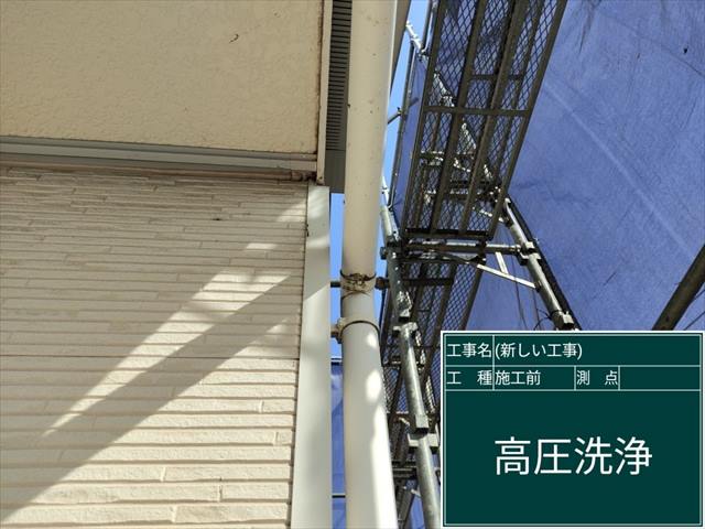築8年の外壁塗装現場は、塗装をおこなう前に蓄積した汚れを落とさなければいけません。