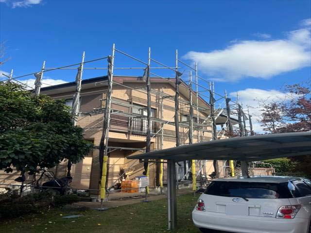 石岡市の雨漏り現場、足場を建てて塗装の前準備をおこないます