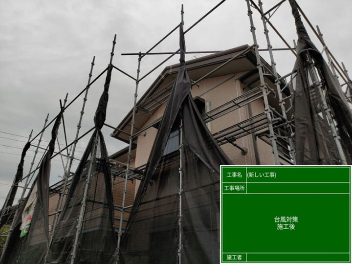 足場が設置出来ましたら、近隣住宅や家屋の周りへ塗料等の飛散防止の為ネットを張ります。この時は台風が近づいていた為ネットはたたみ括り付けておきました。風の強い日には倒壊の危険性が高まりますので、このようにネットはたたみ括り付けておきます。