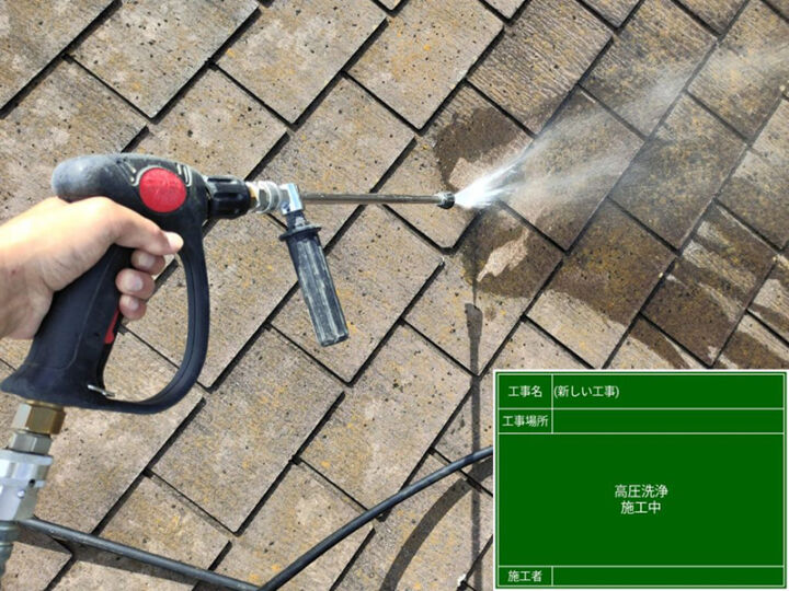 汚れやコケ等が目立っていましたが、溝の間まできれいに取り除く事ができました。作業中かなりの高圧になり足元も滑りやすくなりますので、体勢を崩さないように注意しながら作業を進めます。