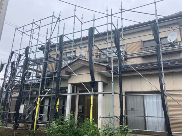 かすみがうら市の外壁塗装現場、施工にあたり足場を設置しました。