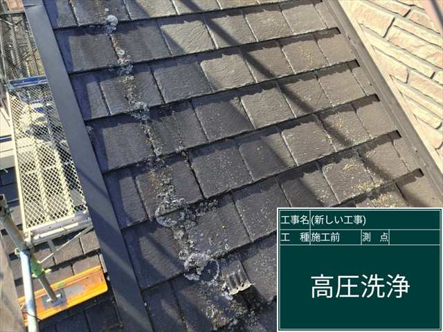 高圧洗浄で屋根に生えた苔や溜まった土埃をしっかりと洗い流していきます!
