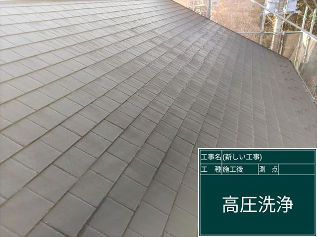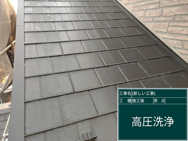 小美玉市の屋根塗装現場、スレート屋根の高圧洗浄の施工前と施工後の写真です。