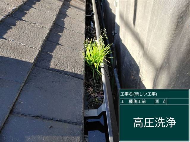 雑草をそのままに高圧洗浄をすると、雨樋の詰まりを促進してしまうので、雑草を抜いて処理してから細かな土埃を洗い流していきました。
