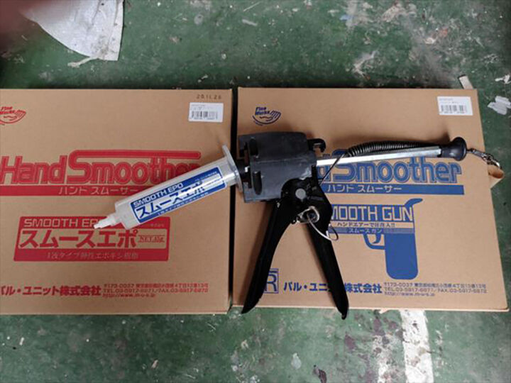 こちらも、表面が剥がれてしまった部分の奥にもひび割れがあったので、スムースエポを充填し、こちらも均しました。