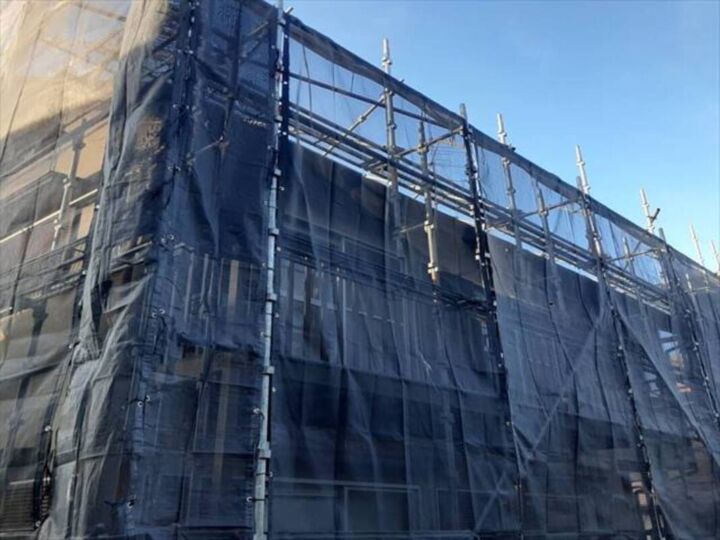 足場を設置します。足場を組み上げるには「足場の組立て等作業主任者」という資格が必要です。足場を組み、塗料の飛散を防止するメッシュシートを取り付けて、作業開始です。