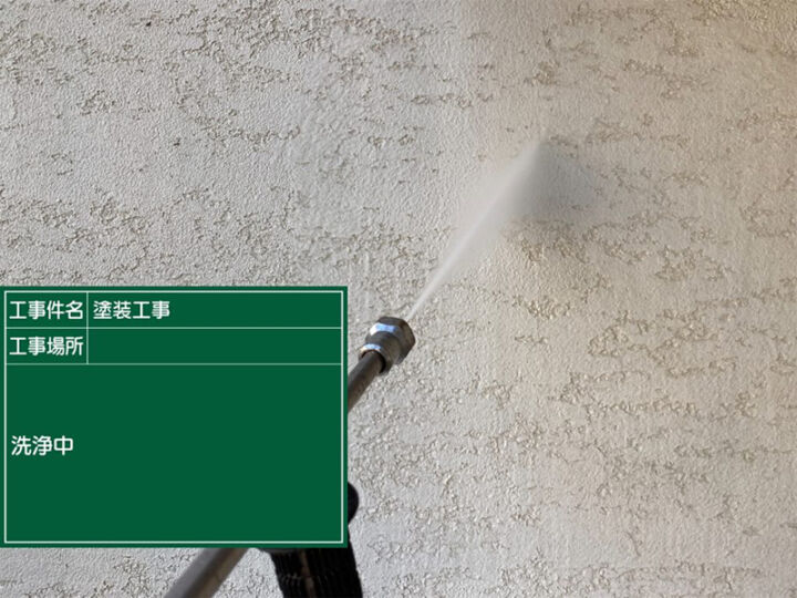 高圧洗浄機を使用して、長年蓄積された汚れや古い塗膜をしっかりと洗い流していきます。