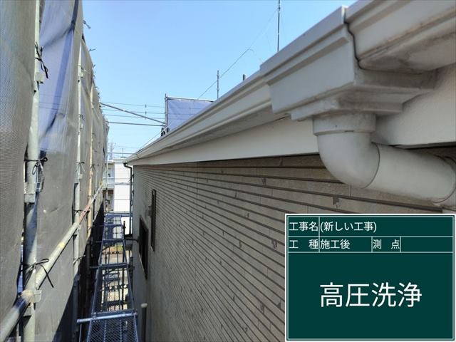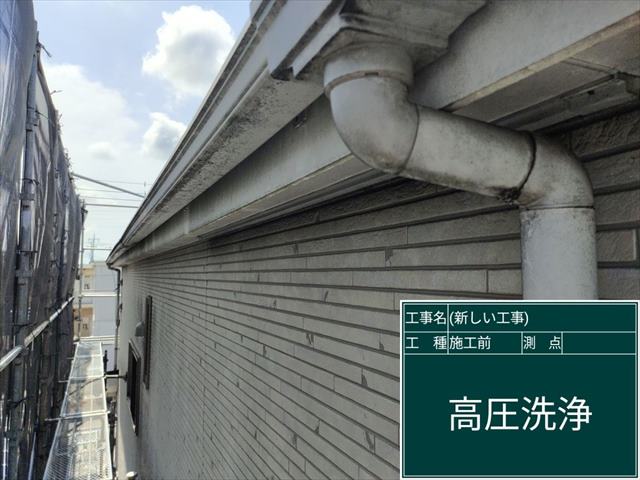 土浦市の外壁塗装現場、雨樋と破風板の洗浄です。