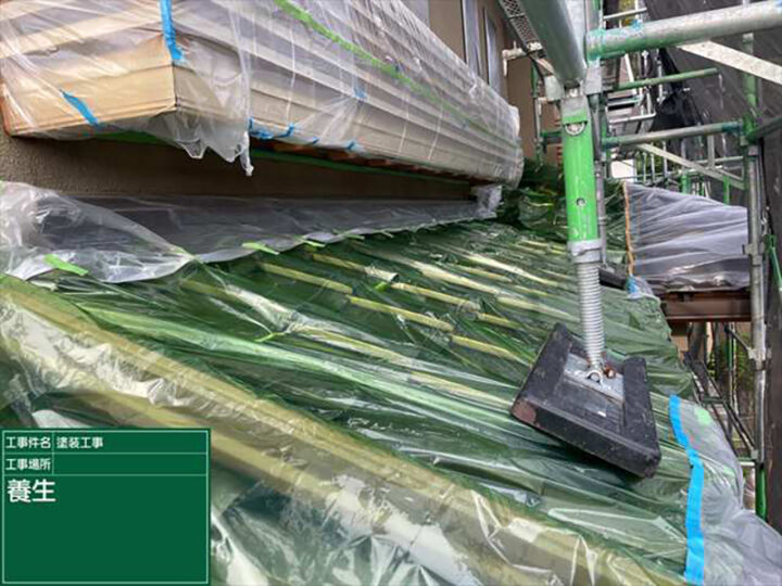 塗料の付着を防ぐために、1階の屋根、雨戸、玄関に養生をおこなった写真です。