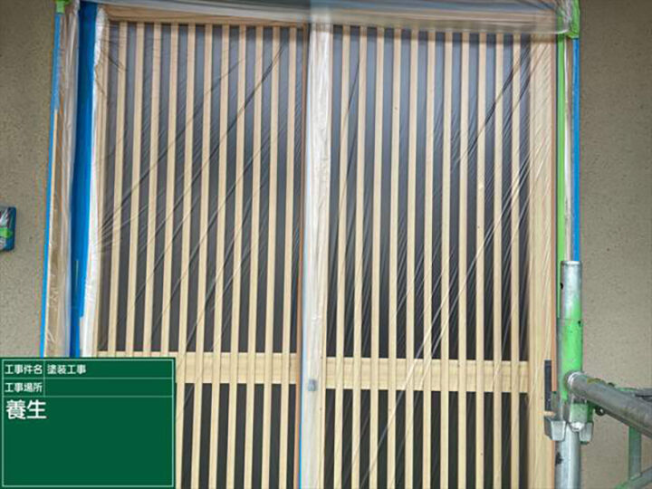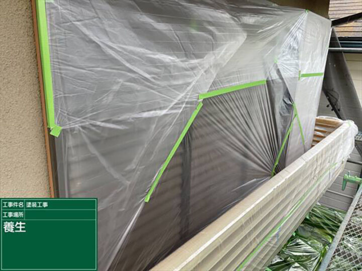 養生とは、写真のようにビニールやテープなどを使い、塗料の付着を防ぐことを言います。