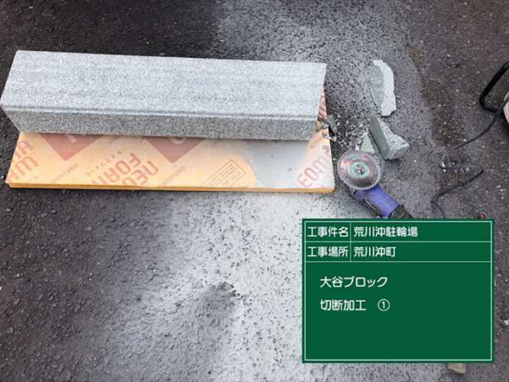 石材を、ブロック塀の長さに併せてカットしていきます。