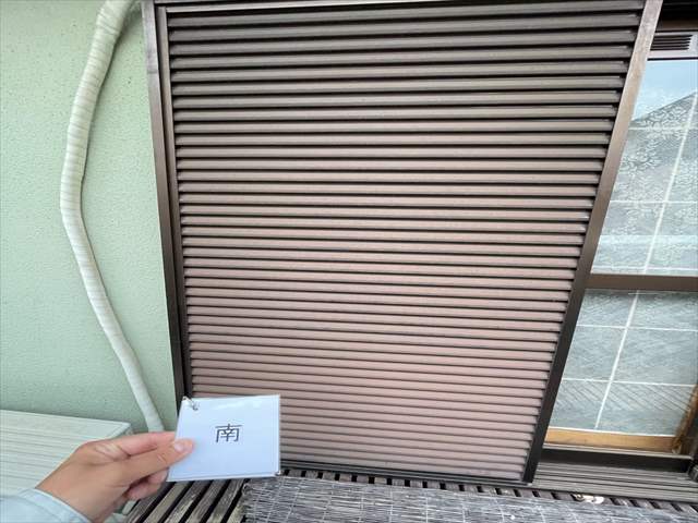 石岡市現場の雨戸は、塗膜の劣化の他、外壁と雨戸の境目が劣化していました。