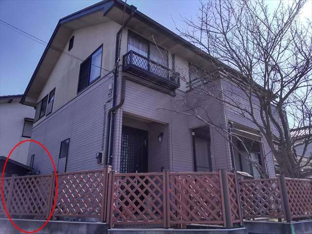 奥のお家は隣家、右側のうっすらピンクがかった窯業系サイディング外壁が今回塗装する石岡市のお家です。
