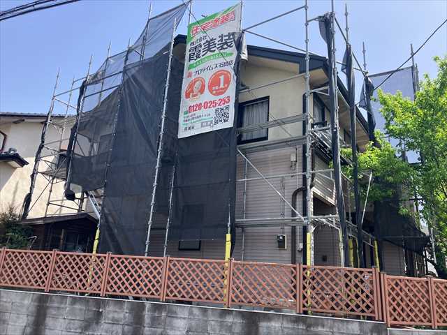 霞美装が施工していることの他、防犯カメラ設置の旨を垂れ幕で知らせています。