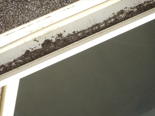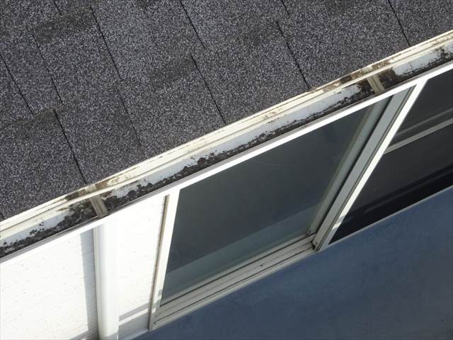 風に運ばれた土埃が雨樋に蓄積しています。