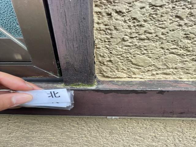 苔に覆われていた北側外壁の化粧柱、こちらも同じ北側ですが、入隅部分がうっすらと緑っぽいかな程度です。