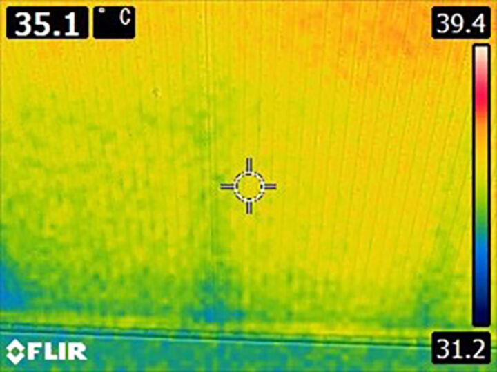 サーモカメラで撮影すると、より直射日光が当たりにくい壁際が青くなっています。