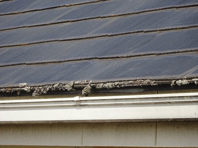 スレート屋根の端部は苔がもしゃもしゃと生えていました。