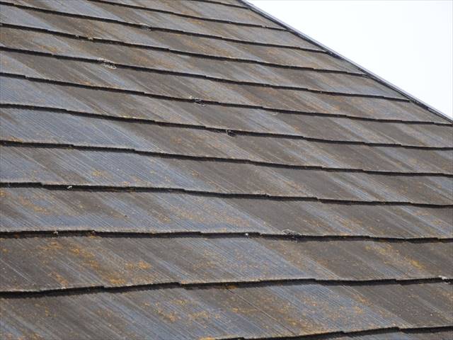 かすみがうら市のスレート屋根、表面塗膜が劣化して防水性が失われて、苔が繁殖していました。