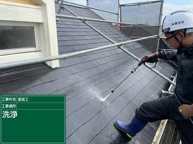 安全のための足場が組まれた屋根から洗浄を始めていきます