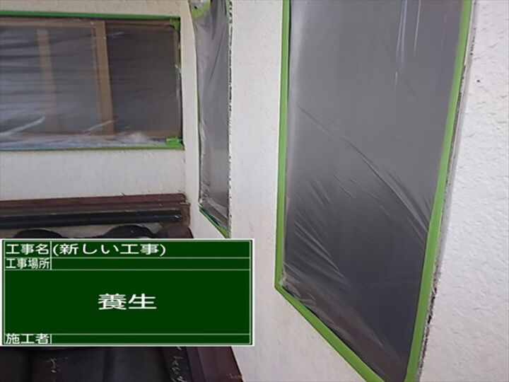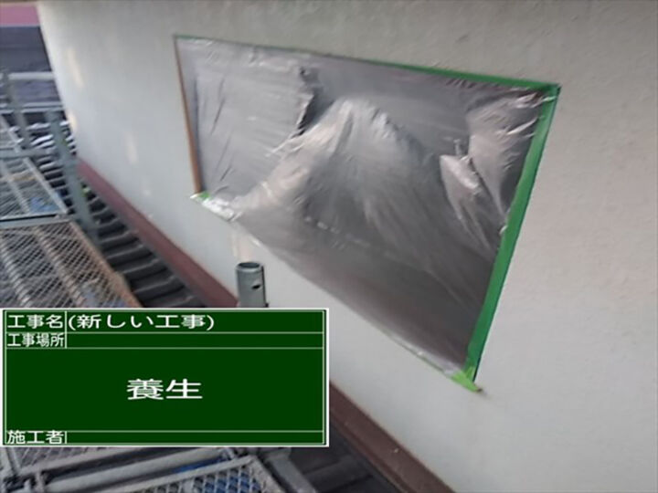 養生はサッシや設備系など、塗装の際に塗料が付着しないようにおこないました。
