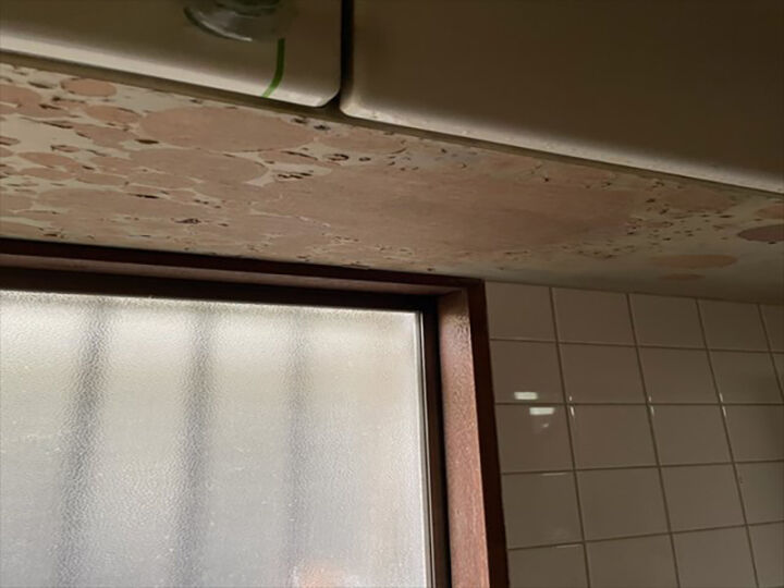 キッチンの吊戸棚の塗装が傷んで下地が見えてしまっています。
